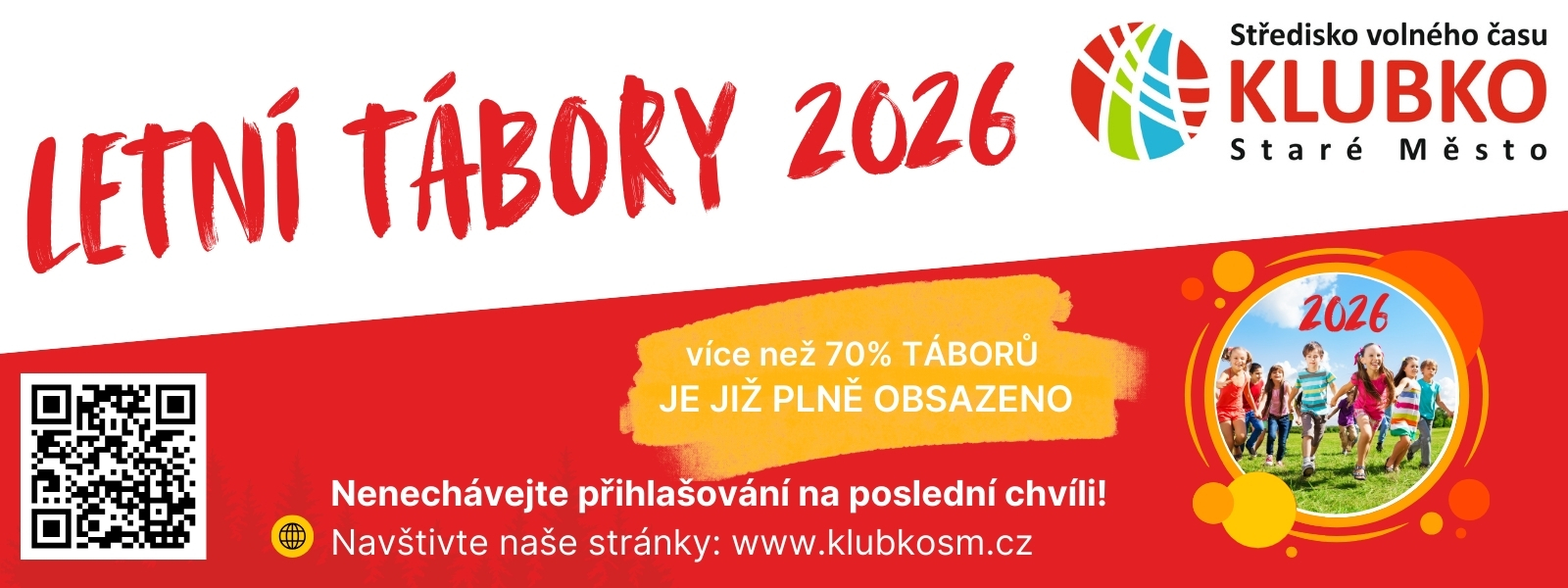 Léto je od toho, aby se pořád něco dělo! Pojď s námi prožít týden, který voní trávou, chutná po dobrodružství a září všemi barvami prázdnin. Čeká nás jízda plná nespoutaného pohybu, tvoření a společných her. Nech se vtáhnout do světa, kde se každý den stává malým zázrakem a kde každé nové ráno odemyká další dílek našeho společného letního objevování! PROSÍME, PŘED PŘIHLÁŠENÍM, SE DOBŘE SEZNAMTE S PODMÍNKAMI VÁMI ZVOLENÝCH TÁBORŮ!! PŘEDNOSTNĚ PRO DĚTI ZE St. Města a obcí MAS Staroměstsko Pokud má Vaše dítě specifické potřeby, kontaktujte nás před přihlášením a probereme, zda je možné zajistit potřebné podmínky a dítě přijmout. V PŘÍPADĚ ZATAJENÍ ZÁSADNÍCH INFORMACÍ O ZDRAVOTNÍM STAVU NEBO SOCIÁLNÍCH PROBLÉMECH DÍTĚTE ZÁKONNÝM ZÁSTUPCEM, MŮŽE BÝT TAKOVÉ DÍTĚ Z TÁBORA PO ZJIŠTĚNÍ SKUTEČNOSTÍ BEZ NÁHRADY VYLOUČENO!! PODMÍNKY PŘIJETÍ NA DOTOVANÝ TÁBOR - tábor je určen pro občany MAS STAROMĚSTSKO - podrobněji viz. zde V případě, že nesplňujete podmínky dotace, je možné se přihlásit a v případě volných míst do limitu podmínek dotace můžeme dítě přijmout. Je nutné i v tomto případě dodat veškeré dokumenty k dotaci!! POVINNÉ DOKUMENTY K DOTACI DODEJTE DO 14 DNŮ OD POTVRZENÍ PŘIHLÁŠKY NA SVČ KLUBKO!! NEVRATNOU ZÁLOHU NEBO CELOU ČÁSTKU UHRAĎTE DO 5 DNŮ OD POTVRZENÍ PŘIHLÁŠKY!! V PŘÍPADĚ NEUHRAZENÍ ZÁLOHY BUDE PŘIHLÁŠKA ZRUŠENA!! Bližší informace k přihlašování zde Další informace k táborům včetně storno podmínek zde