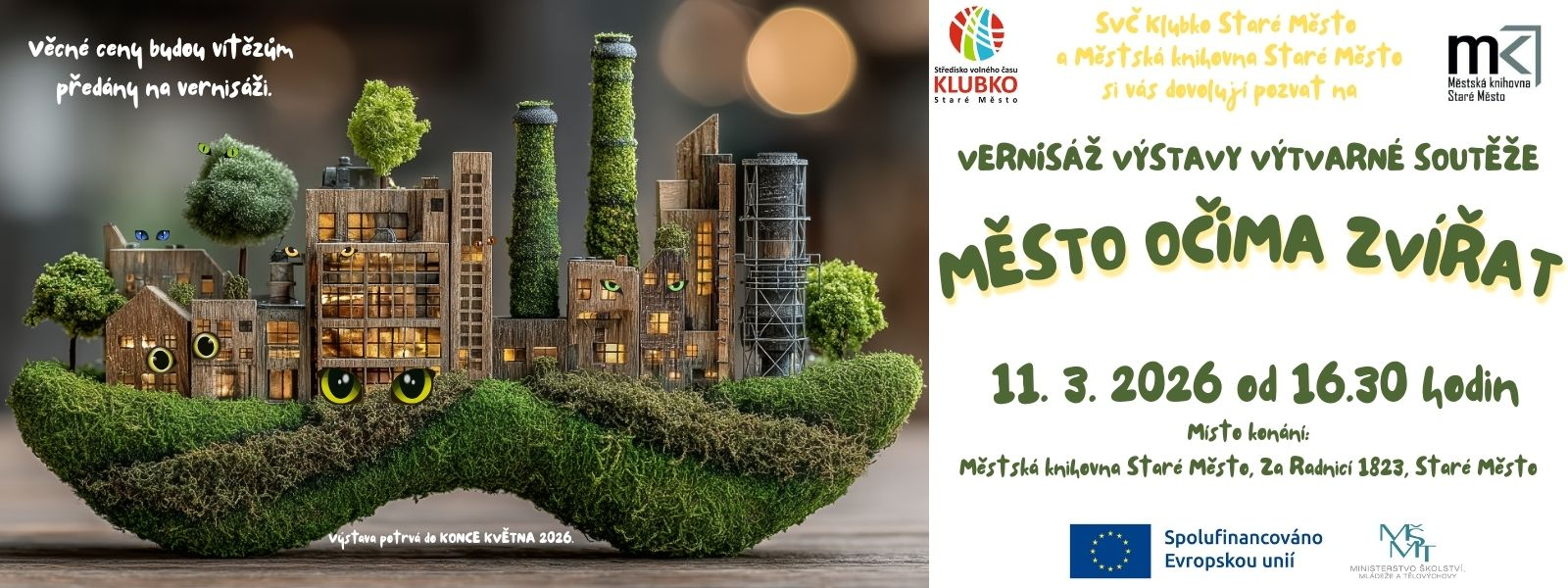 Přijďte se podívat na unikátní výtvarná díla malých umělců. Na slavnostním vyhlášení vítězných prací budou výhercům předány zasloužené odměny. Výstava potrvá do konce května 2026 v Městské knihovně ve Starém Městě. Vernisáž probíhá v rámci projetku "Rozvoj SVČ Klubko 2", spolufinancovaného z EU z OP JAK - Šablony.